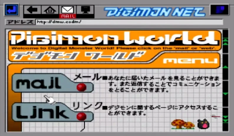 No Mail (メール Mēru), é possível ver as mensagens que enviam ao protagonista. É uma boa fonte de informação. Pode aceder-se ao Instituto Digimon e a um minijogo de matar moscas.